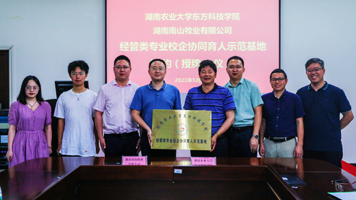 本网讯(教务部 魏坚)5月14日,学院与湖南南山牧业有限公司签订经管类专业协同育人合作协议书并举行授牌仪式,仪式在第九教学楼209会议室举行,由教务部主任魏坚主持。学院常务副院长李觅路、教学副院长肖化柱、经管学部主任文春晖和湖南南山牧业有限公司董事长兼总经理姚慧、营销总监魏先超等参加了仪式。