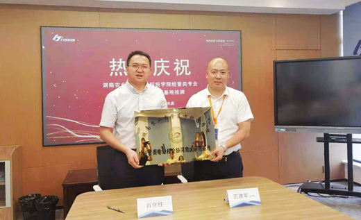 本网讯(教务部  肖羽)6月18日下午,学院教学副院长肖化柱带领经管学部主任文春晖、教务部主任魏坚、副主任罗菁肖羽等一行长沙力拓电子科技有限公司签订“经管类专业校企协同育人合作协议书”并举行授牌仪式。长沙力拓电子科技有限公司总经理范建军、副总经理将楼等出席仪式。