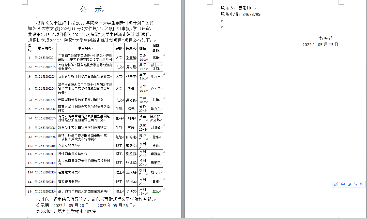 湘农东方教〔2023〕7号 关于公布2023年大学生创新训练项目中期检查和结题验收评审结果的通知