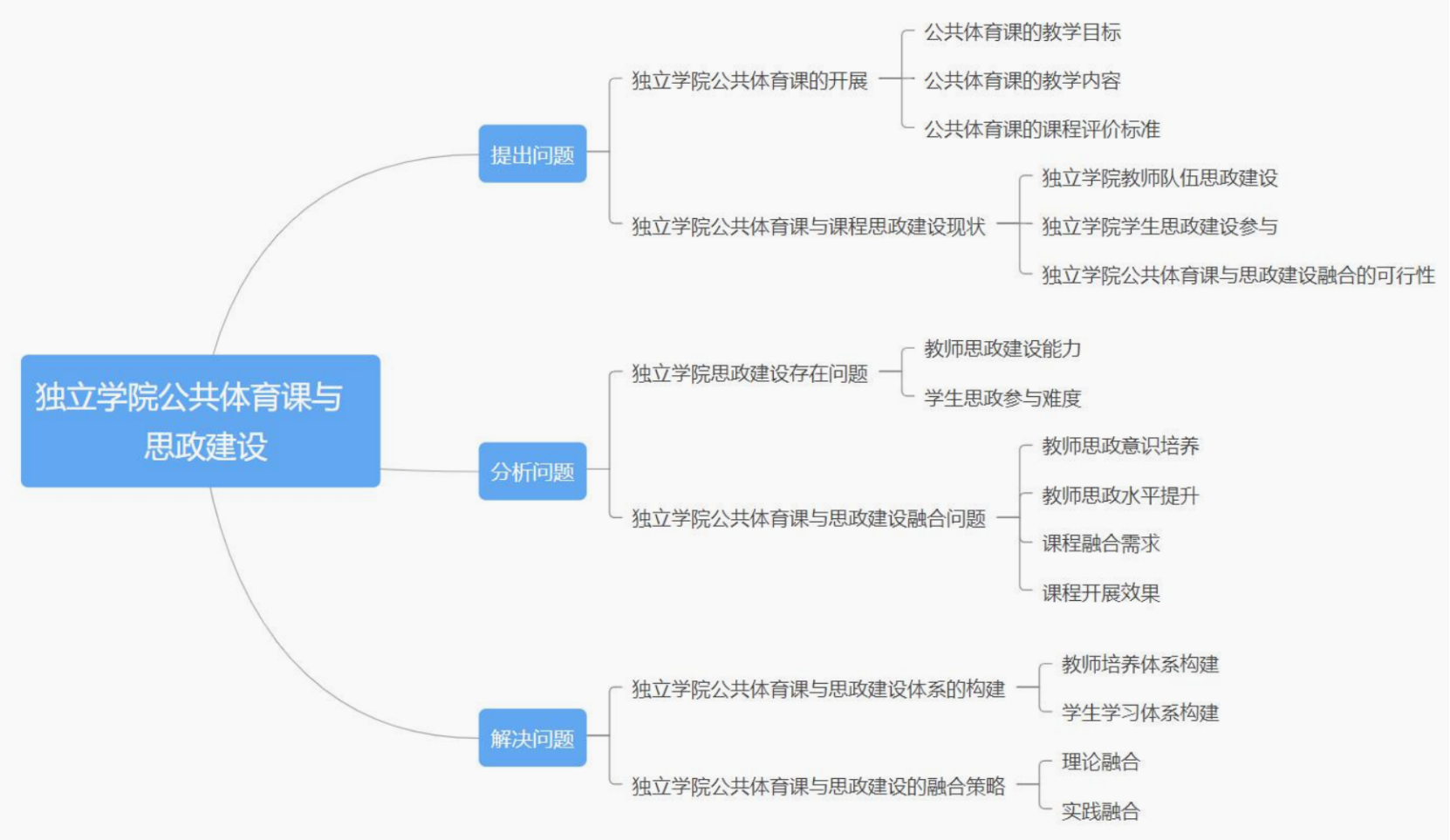研究积极贯彻国家、教育部关于思想政治教育的相关文件要求,以独立学院 公共体育课为切入点,多角度深入研究独立学院公共体育课的类型、教学模式、教学目标等,并与思想政治教育相联系,寻求体育知识性与价值性的统一,通过文献梳理、走访调查等方式,对目前独立学院公共体育课程思政建设现状进行分析,找出公共体育课程思政建设中存在的现实问题、实施难点、主要原因等,从而达到公共体育课与思政建设良性互动、相互配合,共同促进新时代独立学院思想政治教育质量提升。以问题和目标为导向,着眼目标——新时代独立学院思想政治教育质量提升,培养德智体美劳全面发展的社会主义事业建设者和接班人,找准问题——制约目标实现的主要问题,以及解决这些问题、实现目标的有效对策——独立学院公共体育课程与思政建设协同育人的最优路径。
